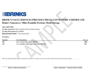 The client will receive a copy of the Miles Franklin and Brink’s inventory Certificate signed by a Brink’s Authorized employee as well as the President of Miles Franklin. The seal number is recorded within internal operating procedures, insuring no tampering has occurred.