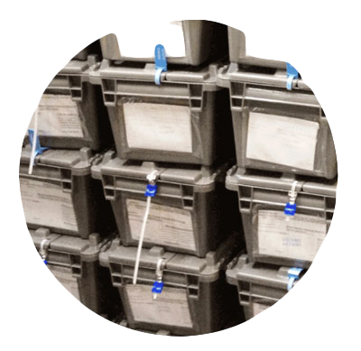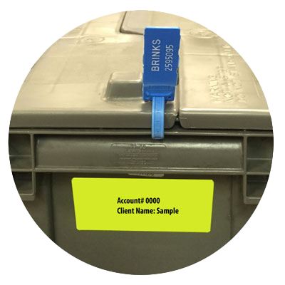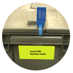 All metals are counted and verified under recorded camera. Next the precious metals are sealed in a stackable hard grey storage bin / box with Brink’s pull tight security seal on each side. That number is entered into books and computers to ensure the client’s box is associated with the correct account. Additionally the clients name is affixed to the bin as well.