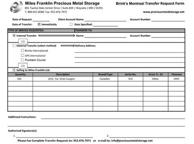 b) Clients will complete the sale with Miles Franklin LTD through their Broker prior to any transfer forms being finalized with Brink’s. Clients are generally paid in 5 business days or less by bank wire or check.