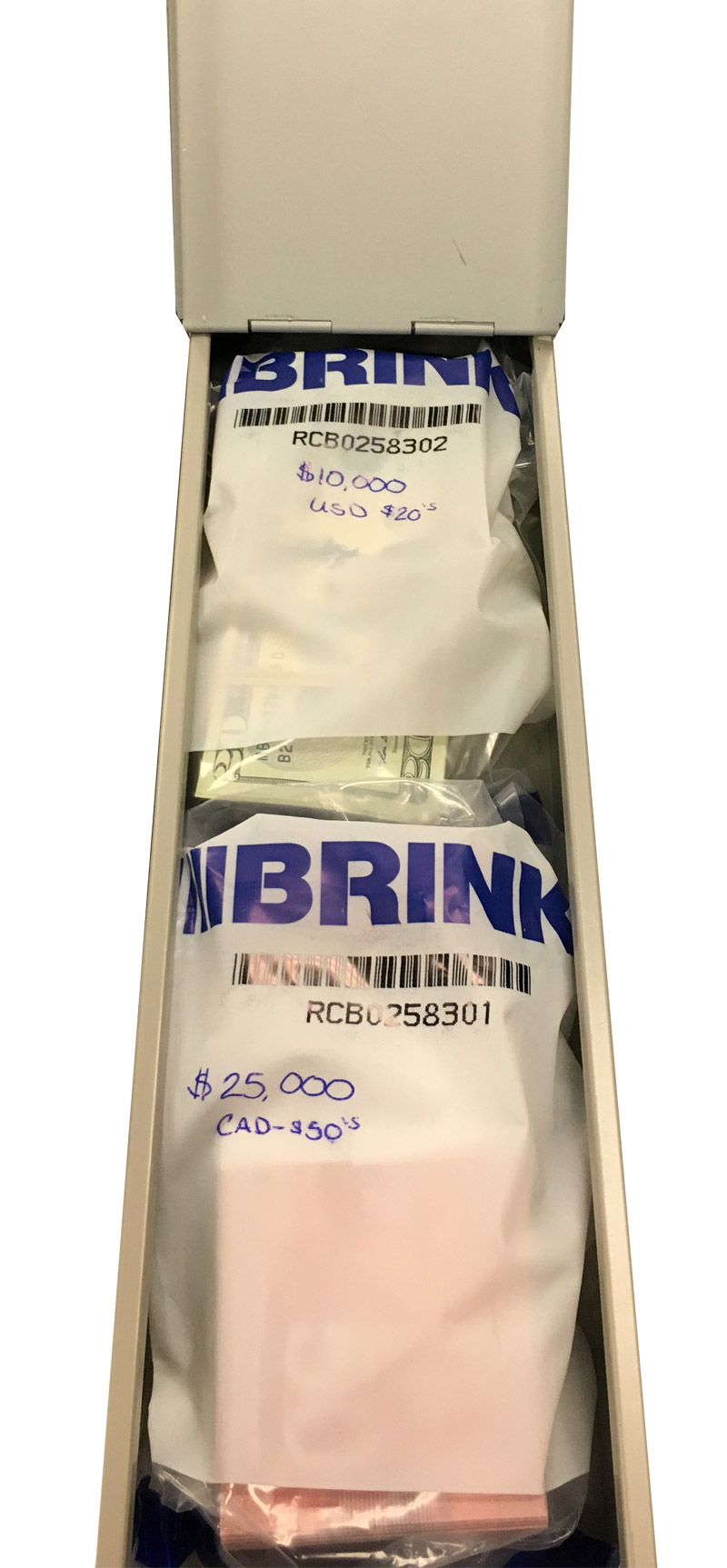 d) Clients must adhere to Brink’s rules regarding sealed bags of cash. All bags of cash are sealed at the Bank, which the amount ordered must be placed in advance and sealed by the Bank in a bag. That sealed Bank bag will now be placed in your box. Brink’s Canada cannot open the bag, or allow a client to open a portion of that bag. The entire bag must be picked up in person, which will be counted and verified with the client, in order for the client to sign the transfer release form confirming the count. Clients cannot deposit cash, or bring their own cash to Brink’s Vancouver or Toronto due to Canadian banking laws. All currency must originate from a bank pick up through Brink’s.