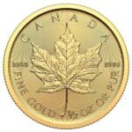 The reverse showcases the iconic sugar maple leaf, designed by Walter Ott. This symbolic leaf has been featured on all Canadian Gold Maple Leaf coins since 1979 and continues to serve as an enduring symbol of Canada’s national identity.