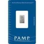 Specifications • Year of Issue: N/A • Denomination: None (private bullion) • Condition: New (Brilliant Uncirculated) • Mint Mark: Not Shown • Manufacturer: PAMP Suisse • Composition: .9995 Fine Platinum • Metal Weight: 0.03220 Troy oz (1 Gram) • Thickness: 0.8 mm • Dimensions: 16.36 x 11.42 mm • Edge Design: Smooth • Series: PAMP Fortuna Series • Packaging Type: Sealed Assay Card • Inner Pack: 25 Bars (Boxed) • Certificate of Authenticity (CoA): Assay Card Included