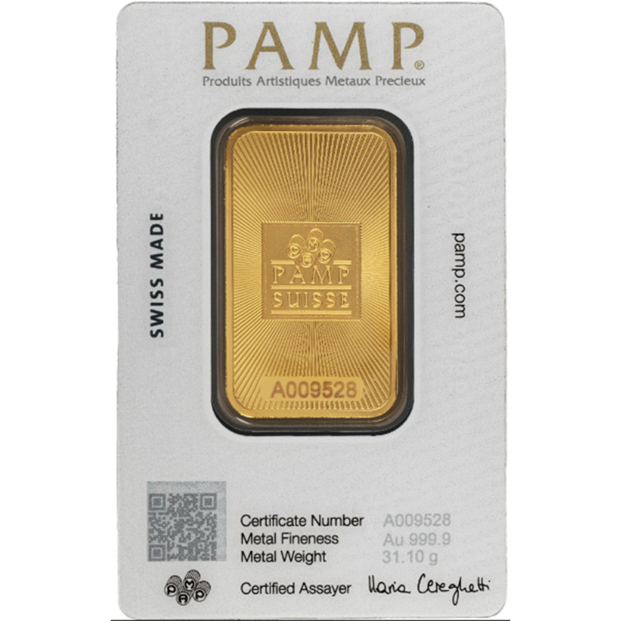 Bar Highlights • Mintage: Ongoing production by PAMP Suisse. • Contains: 1 Troy oz of .9999 pure gold. • Face Value: None – not legal tender. • Packaging: Sealed in protective blistercards with assay included. • Design: New sunburst-style background with modernized PAMP branding. • Security: Includes unique serial number and scannable QR code.