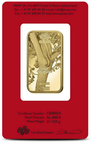 General Overview • The 1 oz PAMP Suisse Lunar Tiger Gold Bar celebrates the Year of the Tiger with a stunning, dual-sided design unique to the Lunar Calendar Series. • Crafted in .9999 fine gold, this bar combines symbolic artistry with exceptional purity and is sealed in a vibrant red blistercard that highlights its Lunar theme. • As with all PAMP products, this gold bar comes with an individual assay card verifying its authenticity, metal content, and serial number.