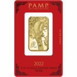 Bar Highlights • Mintage: 2022 edition in the ongoing Lunar Calendar Series. • Contains: 1 Troy oz of .9999 pure gold. • Face Value: None – not legal tender. • Packaging: Sealed in Lunar Calendar-themed assay blistercards; multiples of 25 ship in mint boxes. • Design: Dual-sided tiger imagery celebrating the Year of the Tiger. • Security: Includes individual serial number and matching assay card.