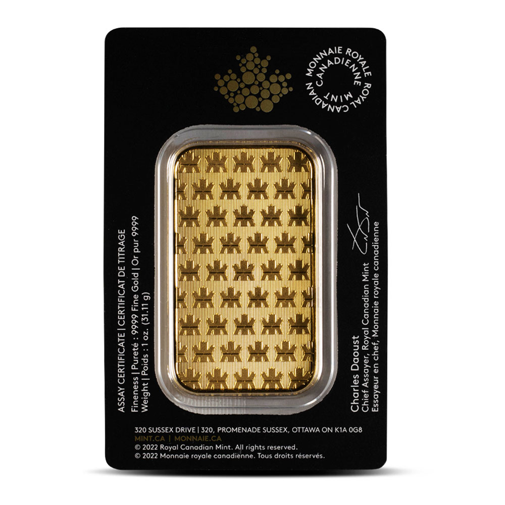 Bar Highlights • Mintage: Ongoing production by the Royal Canadian Mint • Contains: 1 Troy Ounce of .9999 pure gold • Face Value: None – not legal tender • Packaging: Ships in sealed plastic assay packaging (multiples of 25 in boxes) • Design: Obverse features RCM logo and inscriptions; reverse includes repeating mint insignia • Security: Individual serial number and official assay card • IRA Eligible: Yes