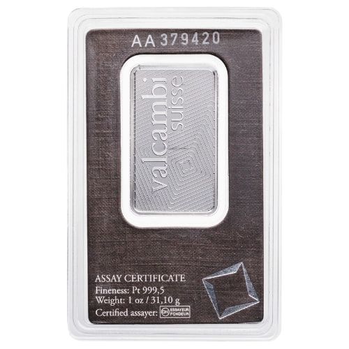 Specifications • Mint Mark: Not Shown • Purity: .9995 • Manufacturer: Valcambi • Condition: New • Edge Design: Smooth • Series: Valcambi Platinum • CoA (Certificate of Authenticity): No (assay included) • Packaging Type: Assay • Package Dimensions: 3.3 x 2.3 x 0.3 inches • Dimensions: 47 x 26 x 2 mm • Metal Weight: 1 Troy Ounce • Thickness: 2 mm • Diameter: 47 x 26 mm