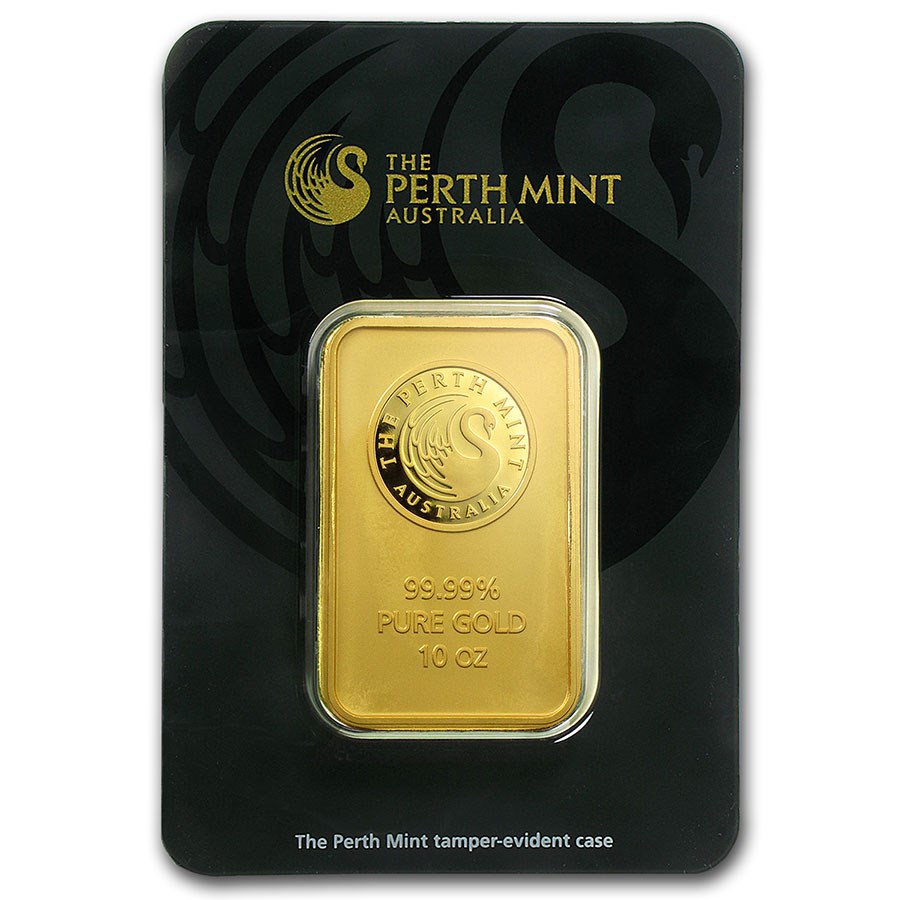 General Overview • The 10 oz Perth Mint Gold Bar is a premium bullion product from one of the most respected mints in the world, combining Australian heritage with exceptional purity and security. • Struck in .9999 pure gold, this large-format bar features iconic imagery and comes sealed in tamper-evident CertiCard® assay packaging for complete investor confidence. • As one of the Mint’s top-selling products, it’s a standout option for those looking to make a substantial investment in physical gold.