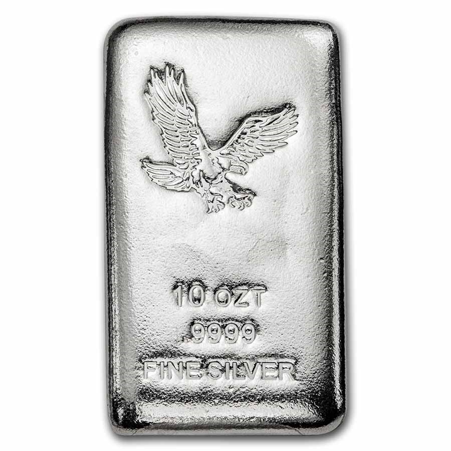 General Overview • The 10 oz Eagle Cast Silver Bar is a striking piece of .9999 fine silver bullion, combining American imagery with the practicality of cast bar production. • Minted by CNT, this silver bar features bold design elements on the obverse and a clean, blank reverse, making it an ideal piece for collectors and stackers alike. • With its low premium over spot, classic cast appearance, and secure packaging, it’s a standout choice for building your silver holdings.