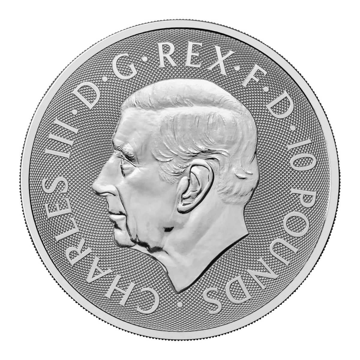 • Includes inscriptions noting the monarch’s name, title, and the coin’s face value (£10).